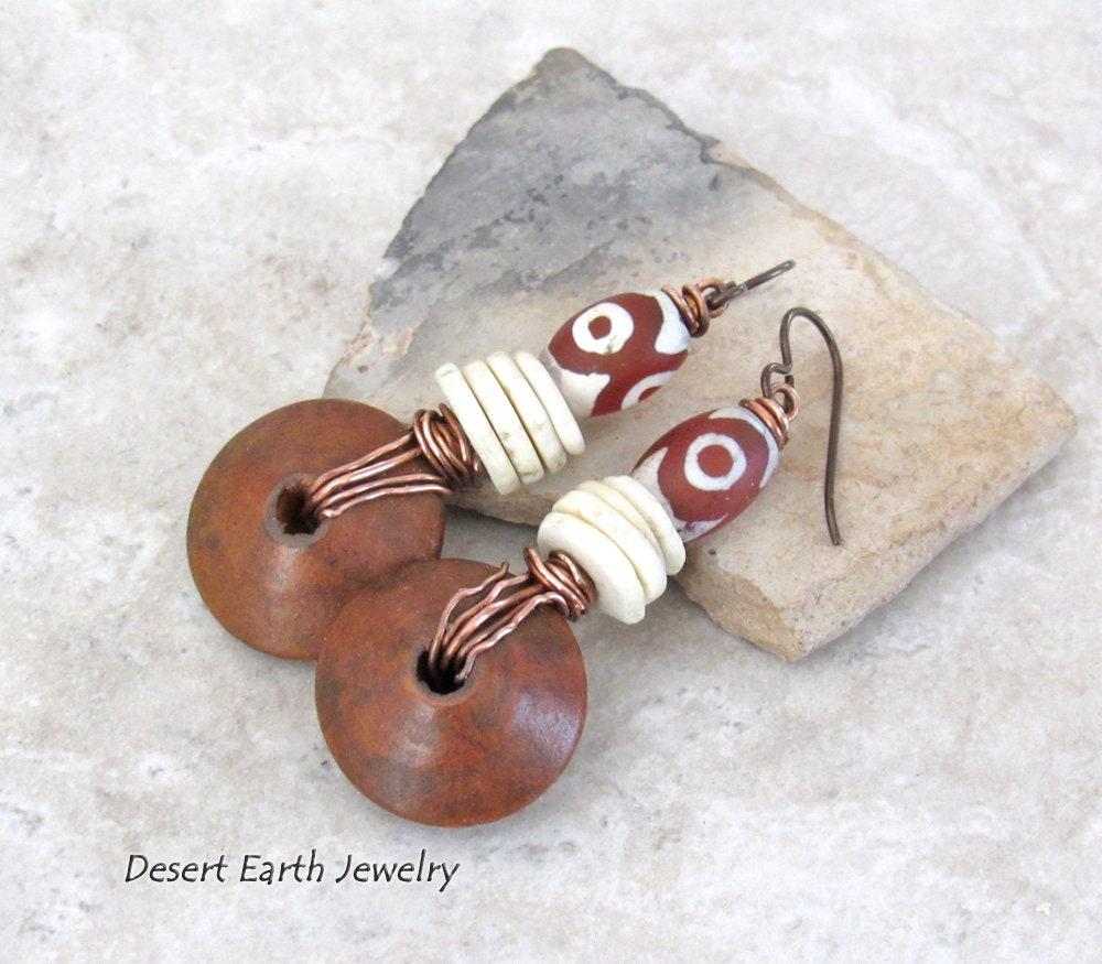 These earrings feature brown wood beads wire wrapped in copper wire accented with Tibetan agate stones with an etched pattern. Slices of ostrich egg shell beads add an earthy contrast. They have an ethnic boho style and will be fun to wear!
