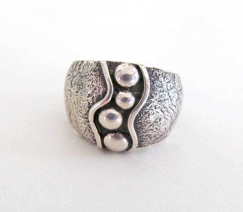 This sterling silver band ring has an earthy, organic texture and will complement all wardrobe styles. The pattern consists of a *pebble-like* hammered texture, along with a meandering line of silver balls framed by squiggly lines in the center. The recessed areas are oxidized, which gives the pattern lovely depth and dimension.