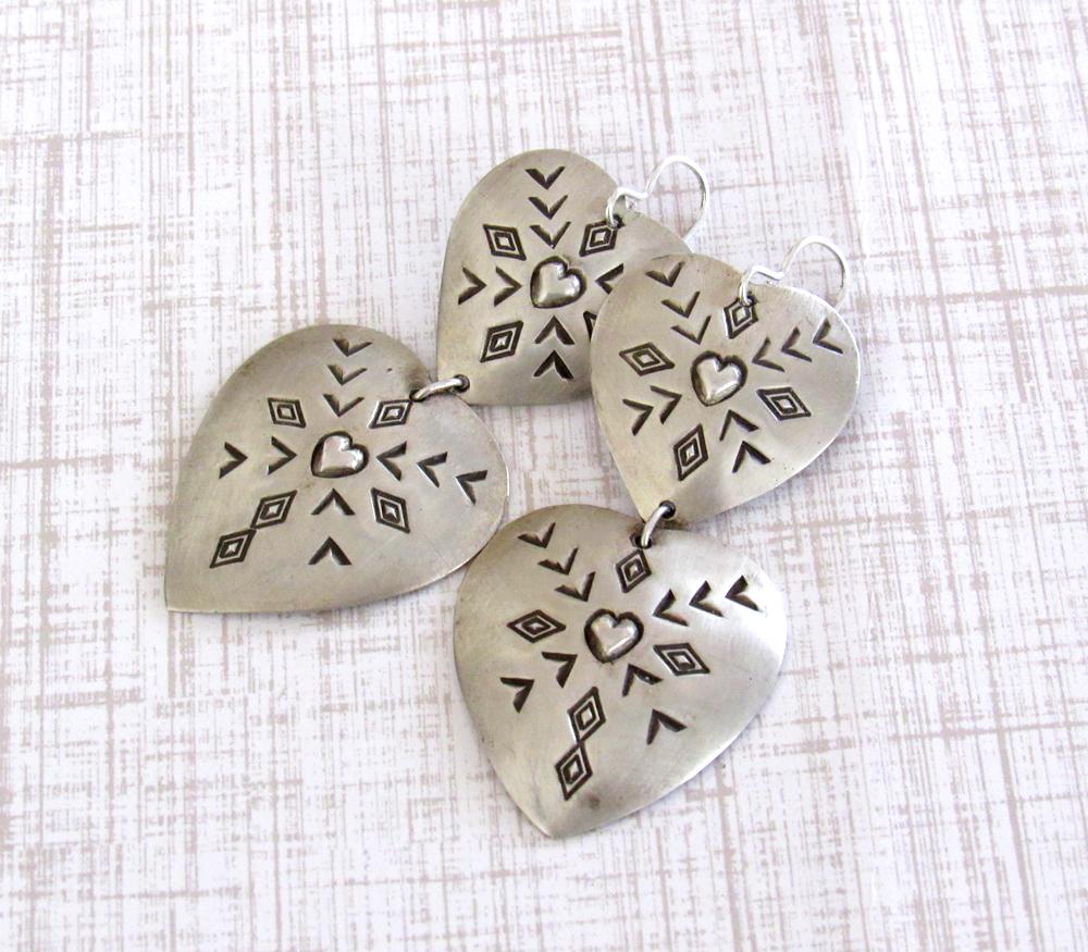 Large Sterling Silver Heart Shaped Concho Earrings - Vintage Southwestern Jewelry