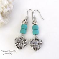 Silver Tone Pewter Filigree Heart Earrings with Turquoise Colored Beads - Romantic Jewelry Gift